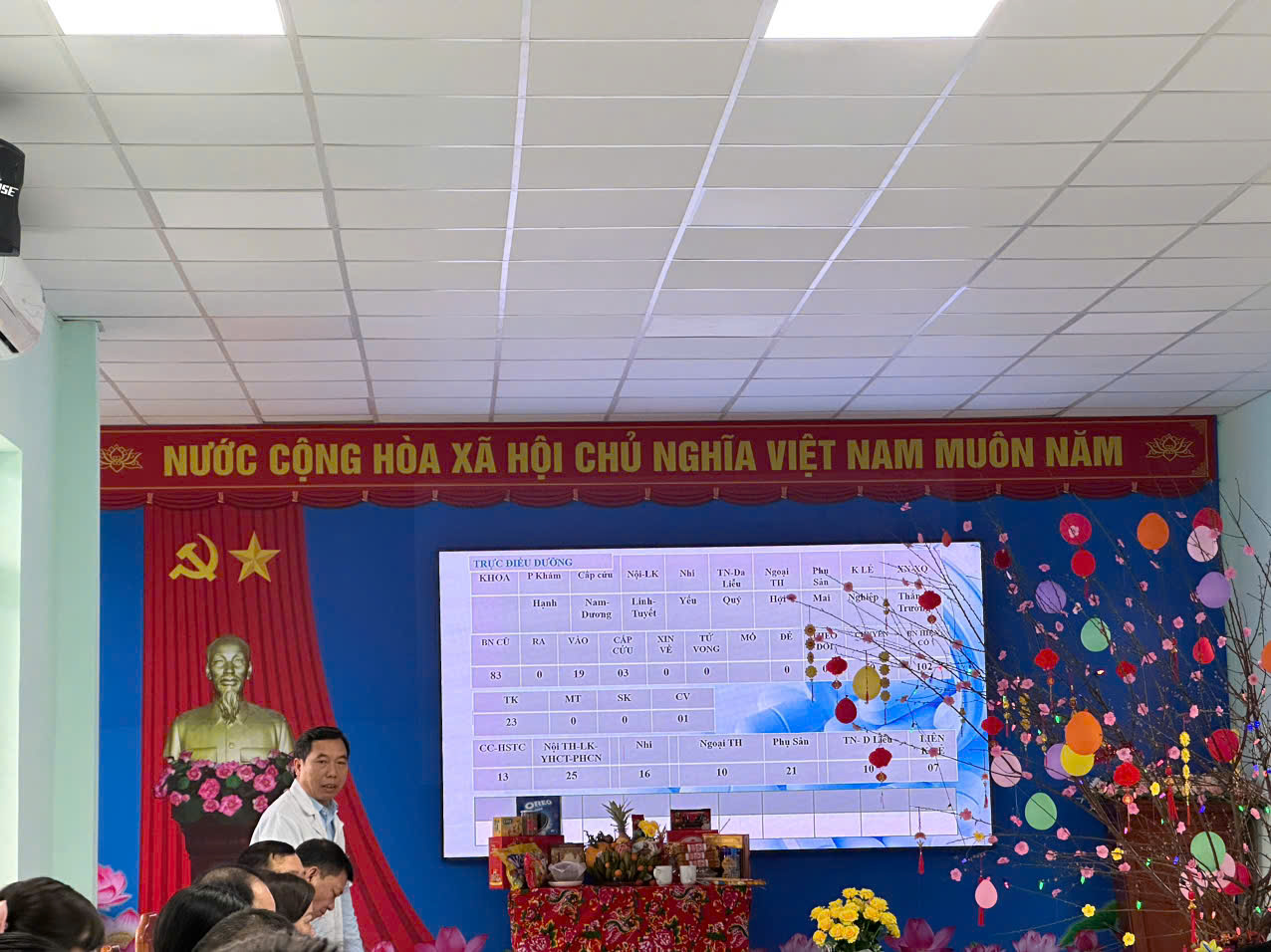 Tham dự có Ban Giám đốc Bệnh viện cùng lãnh đạo các khoa, phòng cùng toàn thể các Y bác sỹ, điều dưỡng cán bộ, viên chức, NLĐ Bệnh viện. Tại buổi gặp mặt, sau khi nghe báo cáo tình hình khám, chữa bệnh trong những ngày Tết, Ban Giám đốc ghi nhận và biểu dương tinh thần trách nhiệm, đoàn kết của đội ngũ viên chức, người lao động khi thực hiện nhiệm vụ khám chữa bệnh, chăm sóc sức khỏe nhân dân trong dịp tết Nguyên đán.